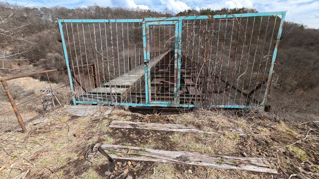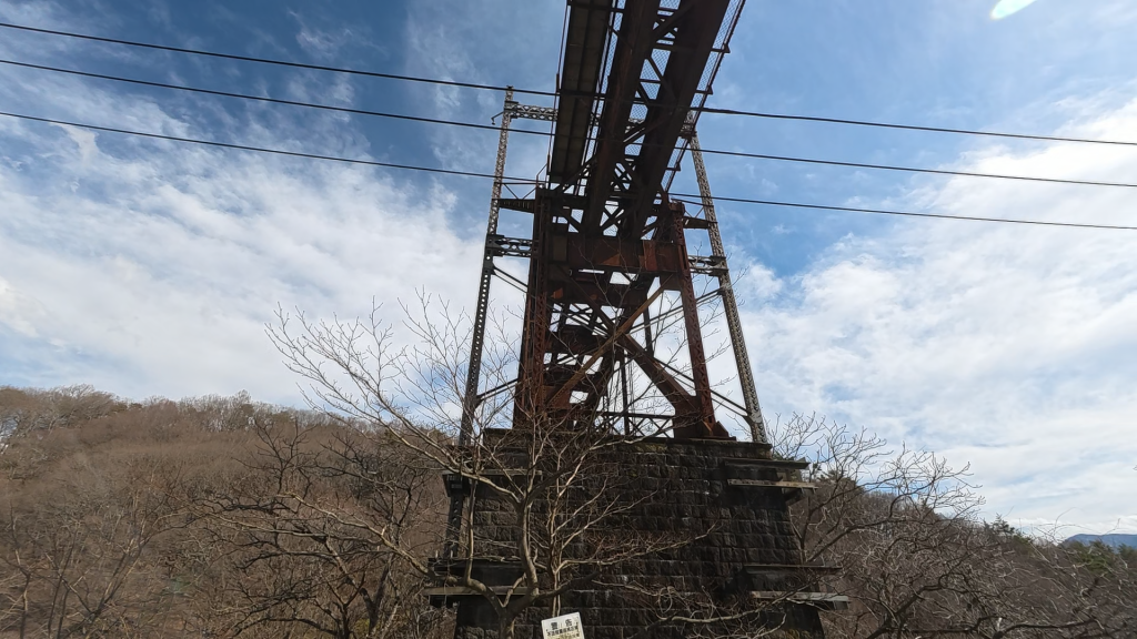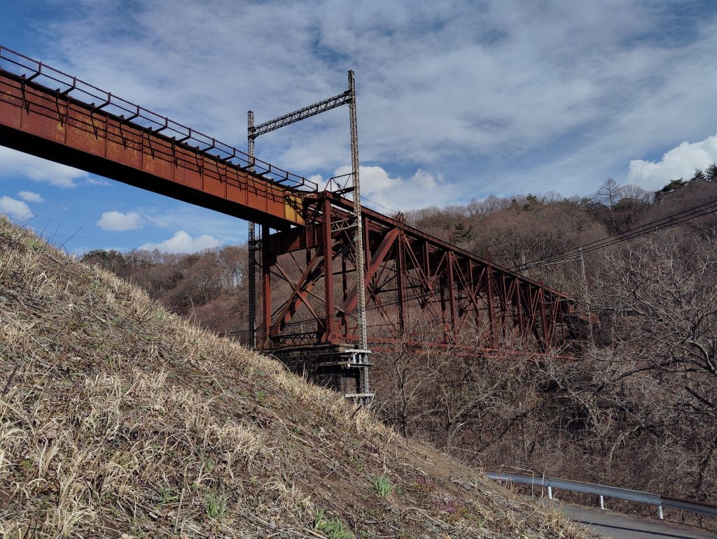 登山というほどでもないですが、横の盛り土のところを軽く登っていくと、橋の付け根の部分までは近付くことができます。